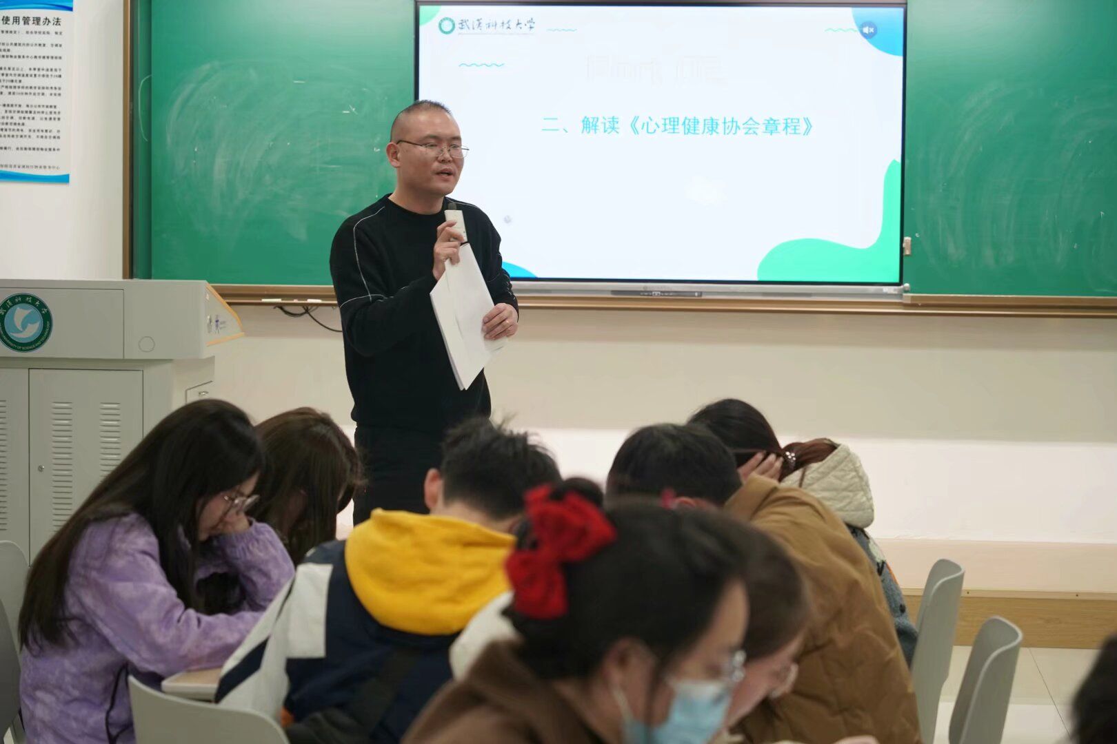 热身环节结束后,贾健宇迅速切入主题,聚焦“心协工作基本方法论”展开讲解。他详细阐述了心理健康教育中心的工作职能,包括心理咨询、危机干预、学生活动等多个方面。此外,他还详细阐述了校心协与心理中心的基本关系,深入解读了心协章程,明确心理健康协会作为校内心理类学生组织的重要地位,介绍了协会的主要任务、各部门职责以及多项规章制度,让同学们对心协的工作范畴与使命有了更为清晰的认识。